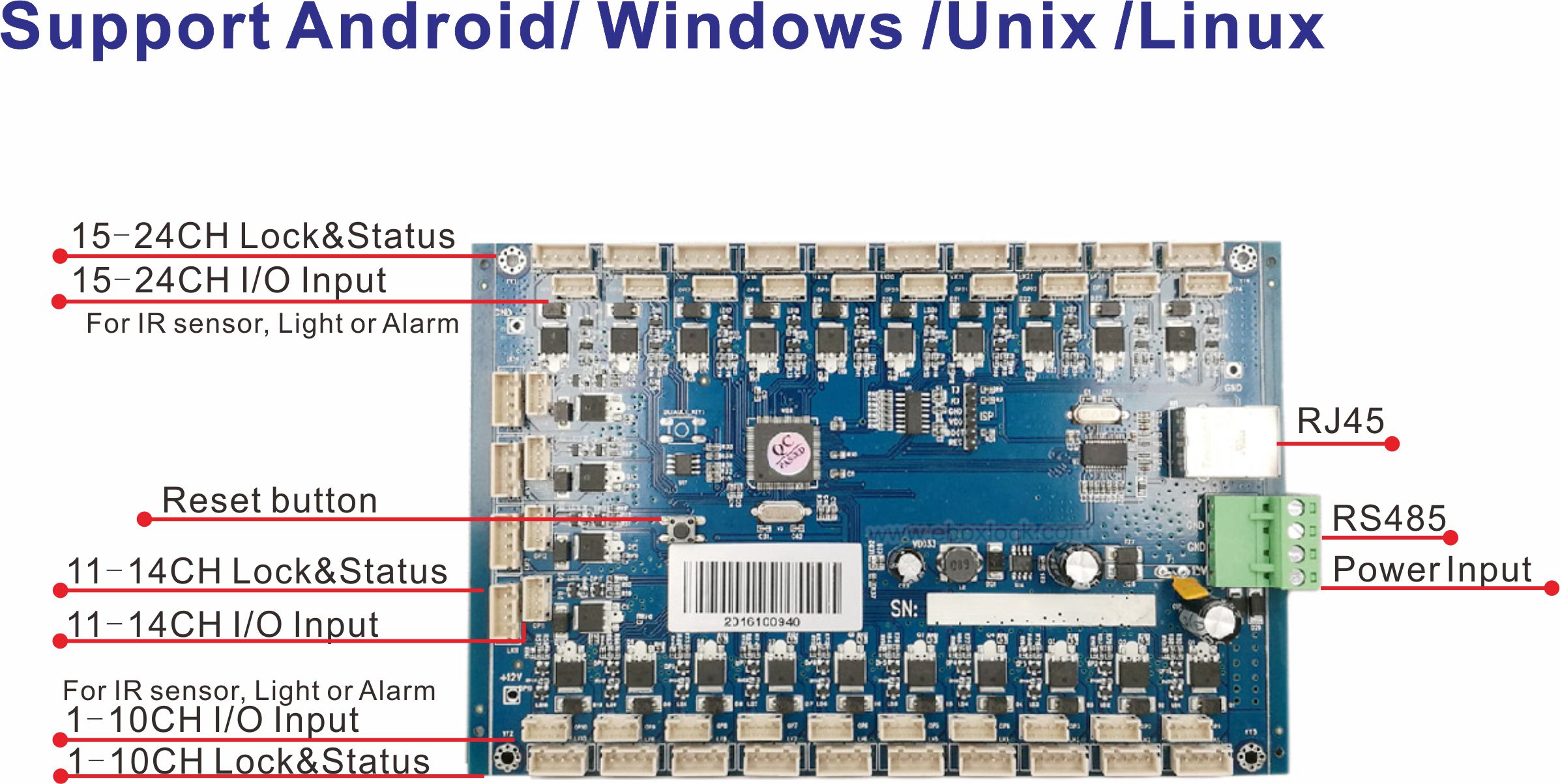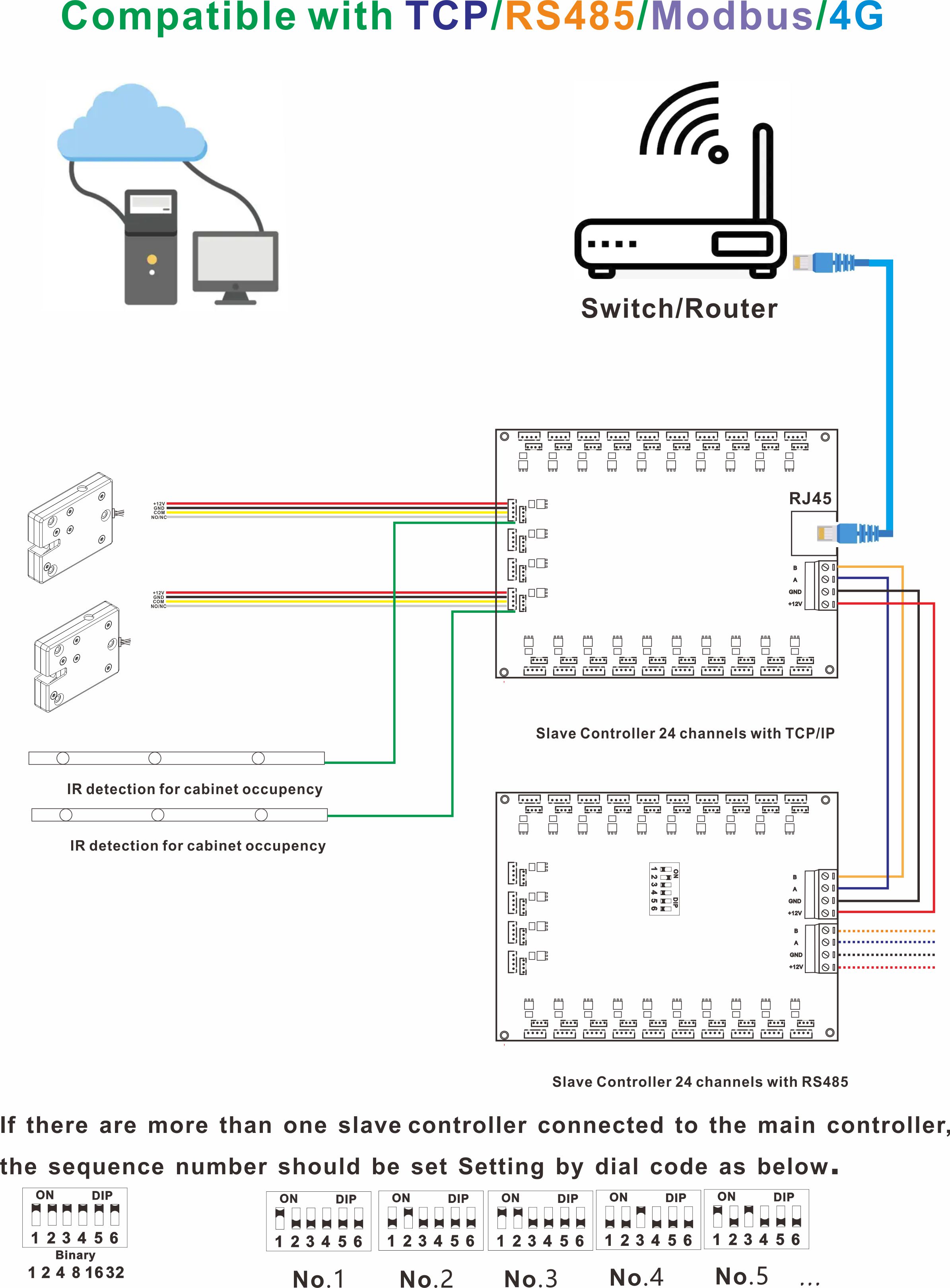 Smart Delivery Locker Controller with TCP/IP AL2445 is a 24 channels relay board that performs lock control in the electronic locker system. It is the interface between the main controller and the electronic locks. The slave controller operates under the control of the main controller and provides relay output to the locks, meanwhile provides report of the door status to the main. A single slave controller can control up to 24 locks, with extension board by RS485 the system is able to control 984 locks, each corresponding to an individual mailbox or locker.